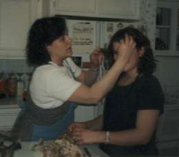 This was a sweet moment. Sarah, who did not balk at the boning-the-chicken job (certainly not my favorite task), was troubled by her hair falling in her eyes. Mom tenderly brushed back her hair, taking her time to enjoy fussing over her daughter.