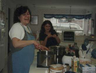 This mother-daughter team not only adds the secret ingredient of love, but also that healing ingredient of laughter! Debi is stirring the melted butter and onion while in the second pot fresh vegetables are simmering. Sarah is boning a fresh roasted chicken that was just taken out of the rotisserie on the back counter. You can see the flour canister, salt and pepper lined up for the next step; and behind that the two boxes of chicken broth. Anyone that knows Sis. Debi appreciates her organization skills, she cooks the same way. It's a joy to watch.