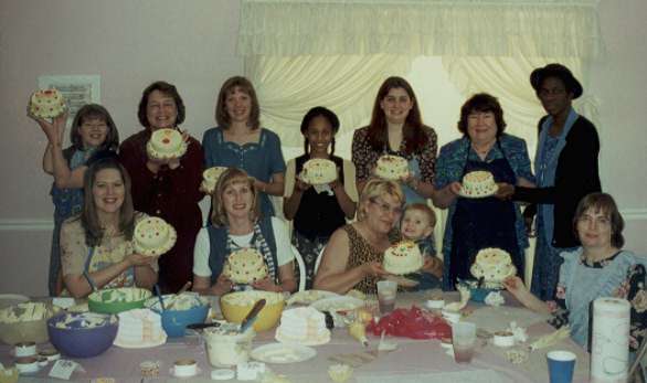 Our Sisters' Study Group was hosted this week in my daughter's home, Sis. Angela Drake. I am so blessed to have her near me, only a few minutes away. Since Angela was also coordinating the cake decorating activity, I came over early to help make eight batches of butter cream whipped icing. When I arrived the house smelled like cake and butter cream, ummmmm! As I walked in the door I saw the dining room had been transformed into a cake decorating party room.