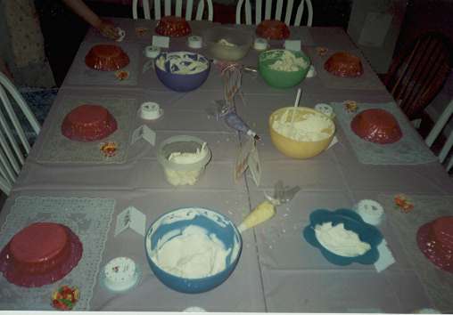 After lunch we all hurried back to Sis. Angi's house eager to start our afternoon activity of cake decorating. Sis. Angi had everything all ready.