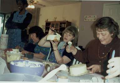 Sis. Nancy Whitehurst was holding her almost two year old grandson, Nathan Luff, on her lap as he was "helping" her decorate her cake. He wanted to "smell" it so she leaned him over to get a whiff but he could not resist and took a bite out of the top of her cake. We all almost squirted icing everywhere laughing at that antic. :-)